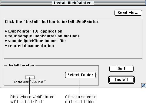 The WebPainter Install window allows you to check the install location and supplies you with a read