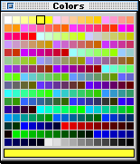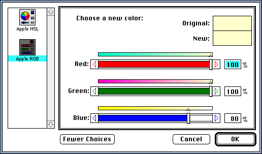 Double-click the color palette to make the following dialog that allows the you to choose the color you want. The default color picker is Apple RGB but you may use other color pickers if you have them installed.